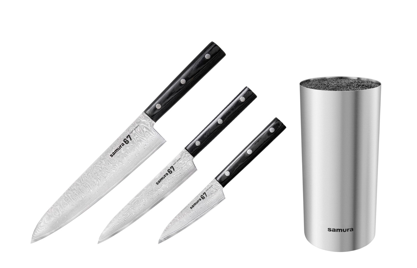Набор из 3-х ножей SAMURA 67 DAMASCUS овощной, универсальный, шеф и стальной подставки