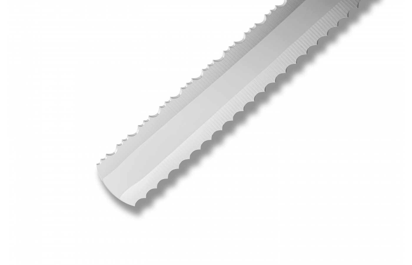 Нож для замороженных продуктов имеет нестандартную заточку лезвия – и снизу, и сверху. Зубчики разной формы хорошо справляются с «пилением» замороженных продуктов с разной текстурой. Можно использовать и вместо томатного или хлебного ножа, для нарезки продуктов с плотной кожурой и нежной мякотью – цитрусовых, ананасов, булочек и т.п.