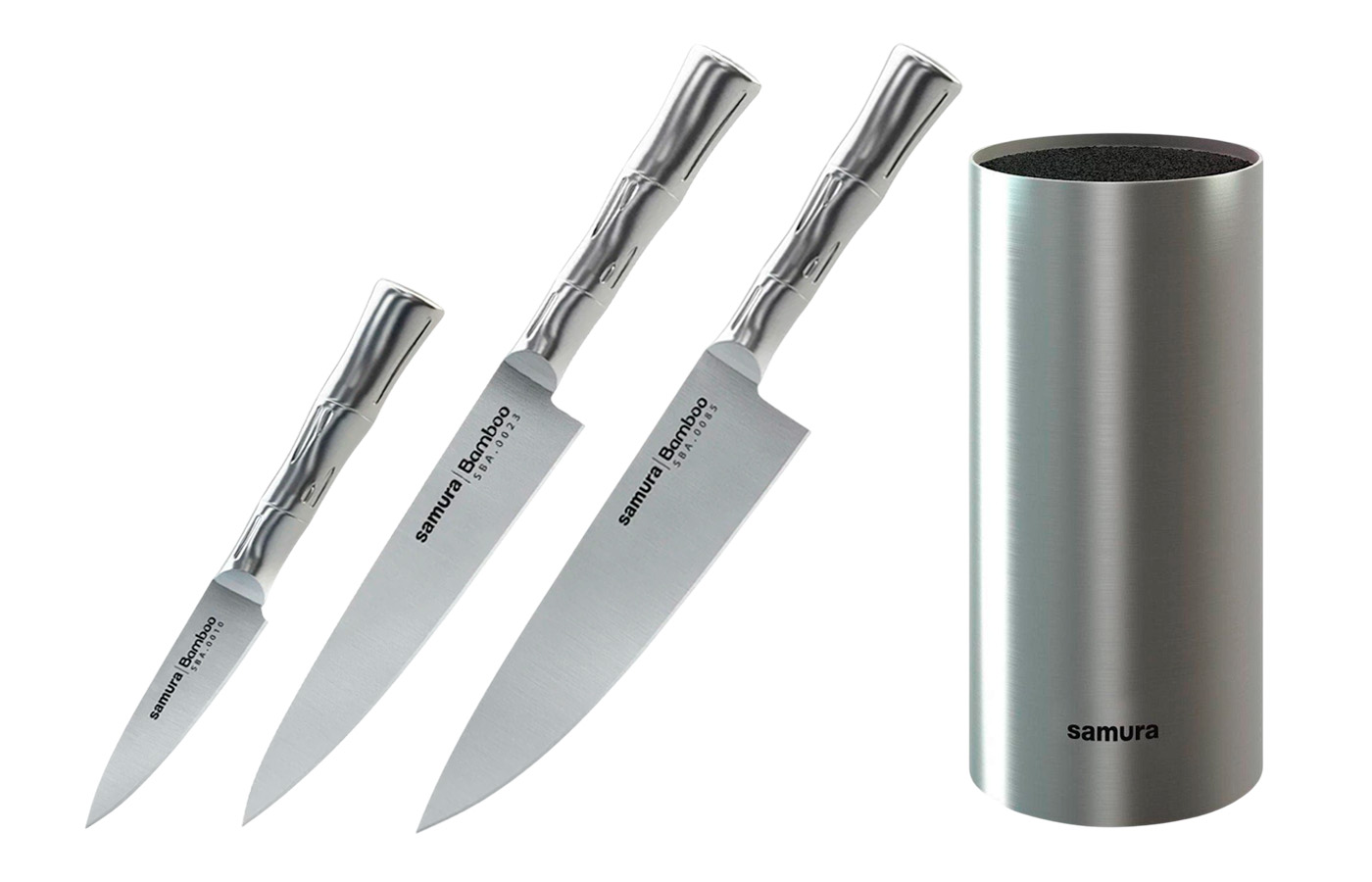Набор ножей Samura Bamboo отличается от других изделий бренда дизайном и цельнометаллической конструкцией. Рукояти стилизованы под стебель бамбука, внутри полые и легкие. Рельеф на поверхности служит и защитой от соскальзывания ладони при работе. Изделия полностью отлиты из стали AUS-8 без швов и стыков. Гладкая поверхность максимально гигиеничная – на ней не задерживаются бактерии и грязь. Лезвия закалены до твердости 58 HRC и долгое время сохраняют бритвенную заточку, не нуждаются в дополнительной обработке. Подставку можно мыть в посудомоечной машине.