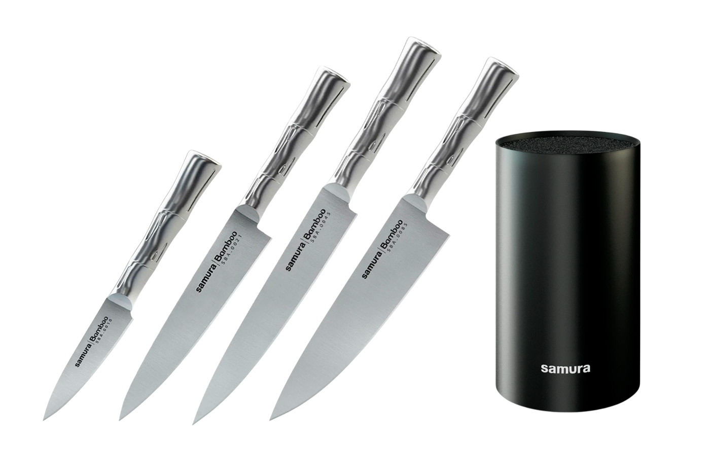 Набор ножей Samura Bamboo практичный и красивый, имеет стилизованный дизайн – рукояти выполнены в виде стеблей бамбука и полые внутри, имеют легкий вес. Конструкция цельнометаллическая — полностью отлита из японской стали AUS-8. Режущие кромки закалены до твердости 58 HRC и заточены на водных камнях под минимальным углом. Точить часто не придется, а если потребуется — сделать это можно в домашних условиях. Набор ножей Самура — это оптимальное соотношение цены и качества. Такой инструмент станет приятным подарком для профессионального повара или кулинара-любителя.
