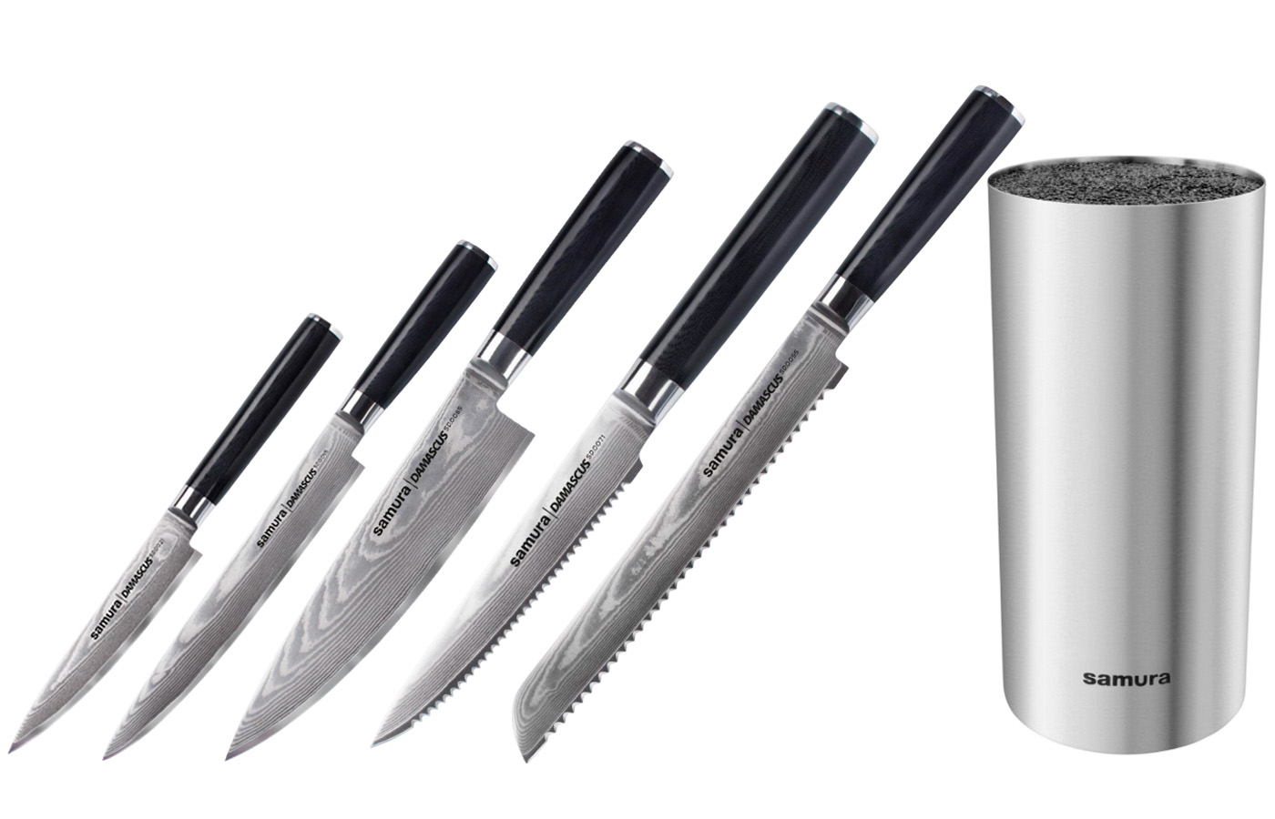 В этой коллекции есть все, что потребуется для создания вкусной пищи — набор из 5-ти ножей Samura Damascus Овощной 90 мм, Универсальный 125 мм, Шеф 200 мм, Для томатов 120 мм, Для хлеба 230 мм и подставки, обеспечивает кулинаров всем требуемым для приготовления изысканных блюд, несмотря на высокую декоративность, они прекрасно режут и медленно затупляются. Клинки производятся из качественного металла, который обрабатывается особым образом, а для рукоятей используется стеклотекстолит.