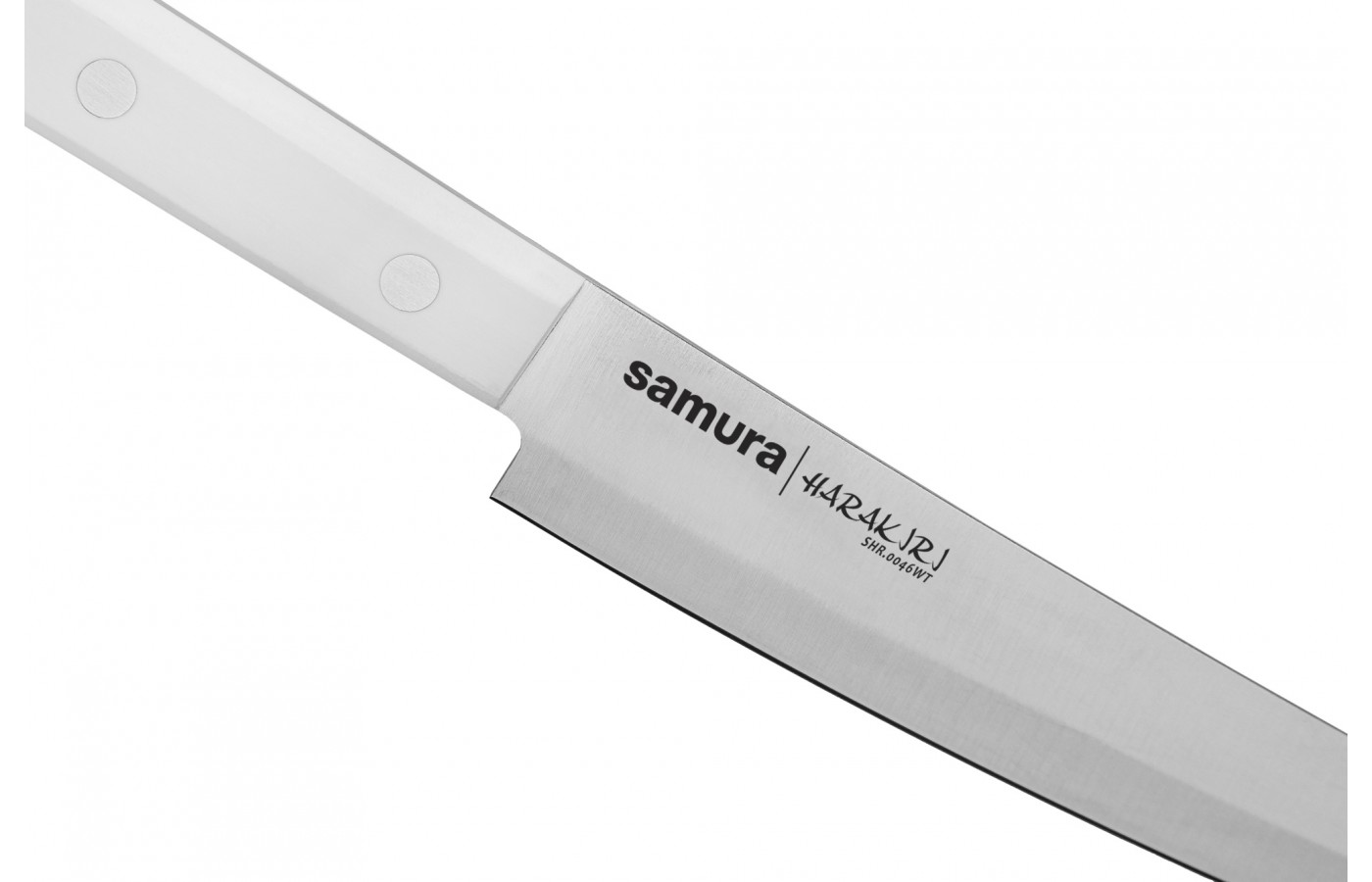 Кухонный нож из коллекции Samura Harakiri имеет более выгодную стоимость по сравнению с клинками из премиум-коллекций, при этом выполнен из технологичных и качественных материалов, обладает высокой работоспособностью. Сделать себестоимость минимальной производителю удается за счет массового типа производства и применения недорогого, но качественного сырья. Так, лезвие ножа для нарезки изготовлено из коррозиестойкой стали AUS-8 со средним содержанием углерода, добавками марганца, кобальта, молибдена. Режущее полотно закалено до твердости 58 HRC и доведено до бритвенной остроты на водных камнях. Режущая кромка долгое время не требует заточки, а после вернуть ему остроту несложно в домашних условиях, с применением подходящих абразивов.