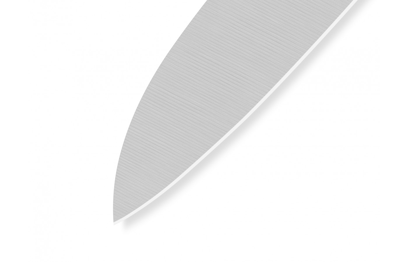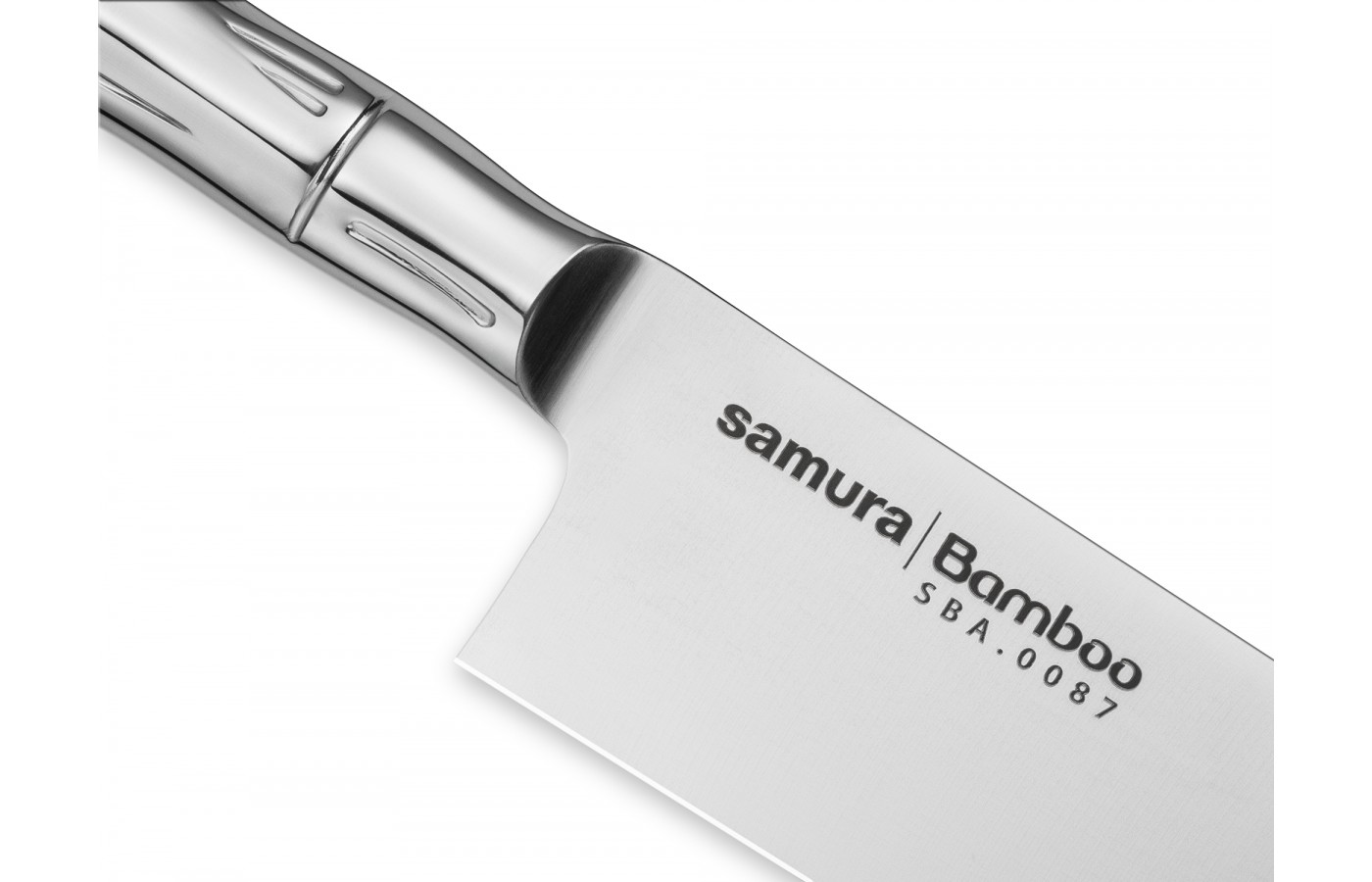Гранд-шеф из коллекции Samura Bamboo обладает уникальным дизайном — рукоять выглядит как стебель бамбука, отсюда и название серии. Однако от известного растения клинок перенял и другие качества. Так, рукоять полая внутри, поэтому несмотря на большой размер, изделие имеет легкий вес – всего 136 г, не перегружает руку даже при долгой работе. Кроме того, клинок износостойкий и надежный, с долгим сроком службы. Полностью изготовлен из японской стали AUS-8, известной своими антикоррозионными свойствами и высокими показателями прочности. Лезвие закалено до твердости 58 HRC и заточено на водных камнях. Благодаря добавкам марганца, кремния, молибдена, ванадия в сплав обладает умеренной гибкостью, а режущая кромка максимально стабильная. Крайне долго остаётся острой, а при необходимости заточить ее можно в домашних условиях — сталь легко поддается обработке.