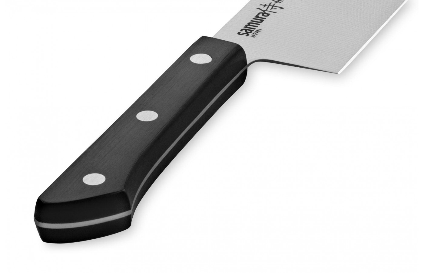 Рукоять ножа Samura изготовлена из жаропрочного ABS-пластика, приятная на ощупь и не скользкая. Классический черный цвет подходит к любому интерьеру кухни. Материал не впитывает влагу, пищевые красители и запахи, гигиеничный и легко моется. Хвостовик лезвия проходит через всю рукоять, а обкладки из пластика надежно зафиксированы заклепками.