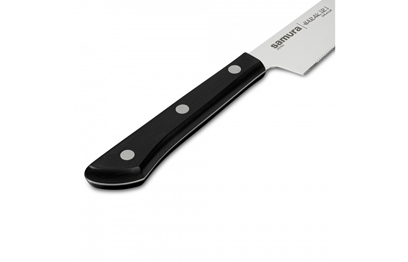 Нож-серрейтор из серии Samura Harakiri имеет незамысловатый дизайн и доступен по цене (самая недорогая коллекция бренда), при этом выполнен из качественных материалов и заточен до безупречной остроты на водных камнях. Лезвие изготовлено из японской стали AUS-8, закаленной до твердости 58 единиц по шкале Роквелла, устойчивой к коррозии и преждевременному затуплению. Точить нож часто не придется, ведь зубчики способны разрезать продукт, даже если их вершины утратили изначальную остроту. А своды арок между зубьями очень долго остаются острыми, так как не контактируют с твердыми поверхностями (разделочной доской и тарелками, например). Соответственно лезвие может сохранять отличную работоспособность без заточки вплоть до полного срока службы изделия.