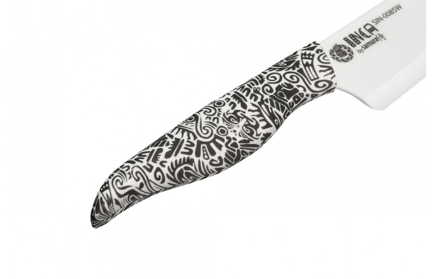 Шеф-нож из коллекции Samura Inka оснащен широким лезвием белоснежно белого цвета и необычной формы — кончик почти прямоугольный, без выдающегося острия. Такая конструкция обеспечивает минимальный зазор между ножом и доской, поэтому можно резать без отрыва кончика инструмента от поверхности.