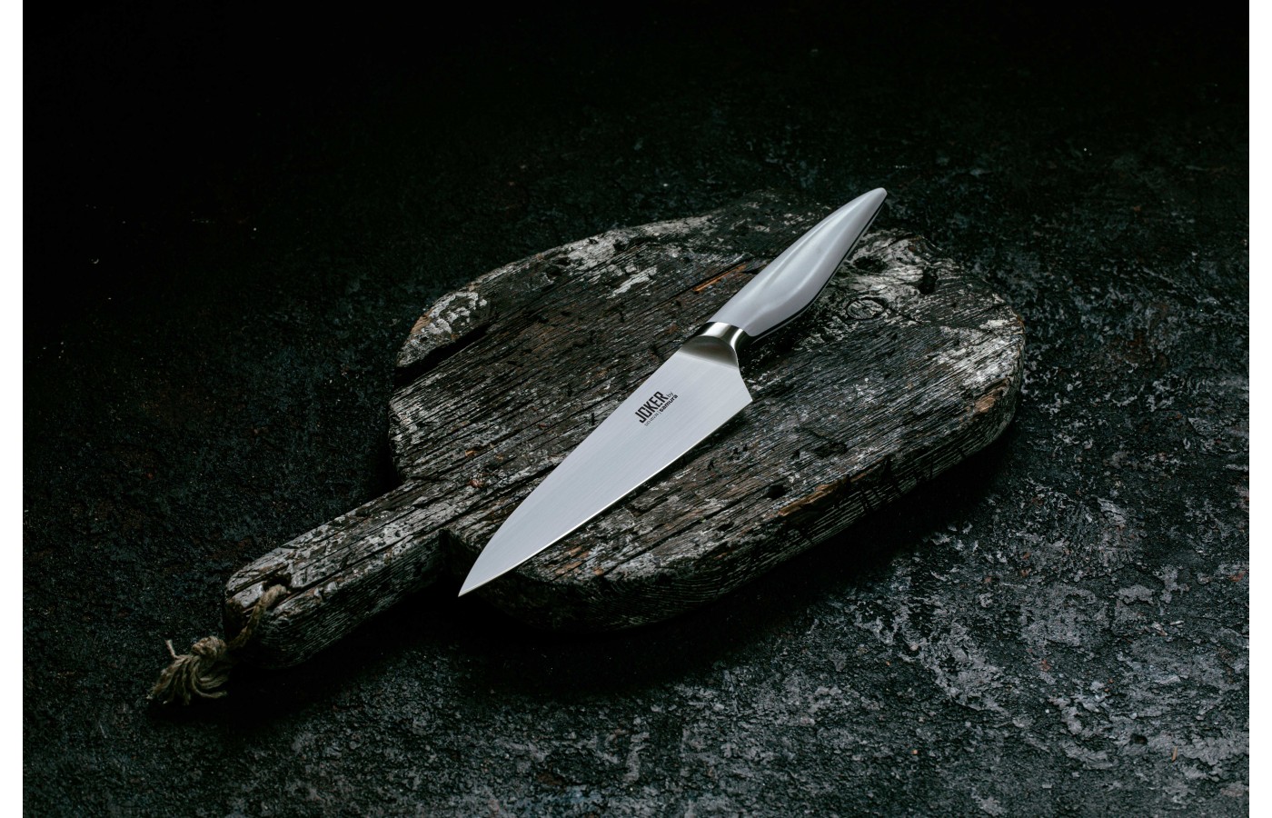 Универсальный нож из серии Samura Joker имеет необычный стильный дизайн. Лезвие по ширине основания не уступает европейскому шефу, но резко сужается к острию и короче по длине – всего 170 мм. Кончик находится ниже линии обуха, тем самым клинок по форме имеет черты, схожие с кинжалом. При это изделие компактное и имеет оптимальный вес за счет однослойного лезвия из коррозиестойкой стали AUS-8 твердостью 58 HRC. Режущая кромка заточена под минимальным углом и долгое время сохраняет первозданную остроту.