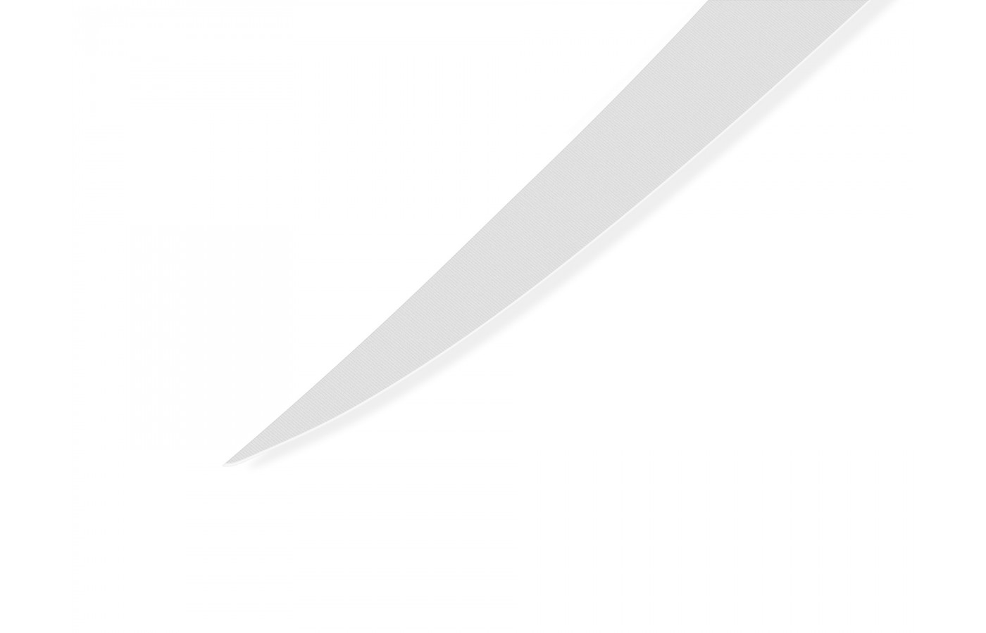 Короткий слайсер 220 мм из серии Mo-V может использоваться как на домашней, так и не профессиональной кухне. Его прочное лезвие из молибден-ванадиевой стали (оптимальная закалка в 59 HRC) не только успешно противостоит ржавлению, но и способно длительное время сохранять безупречность режущей кромки.