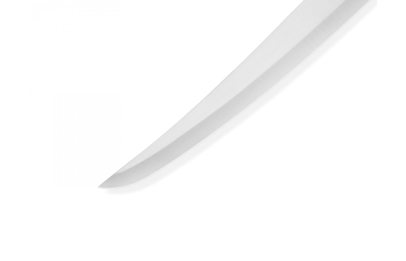 Дополняет конструкцию рукоять из технологичного материала – стеклотекстолита G-10. Этот композит не боится высоких температур, повреждений и царапин, ударопрочный и долговечный. Рукоять элегантного черного цвета имеет традиционный японский дизайн и цилиндрическую форму, приятная на ощупь и с антискользящим покрытием.
