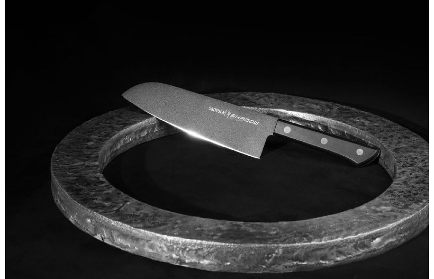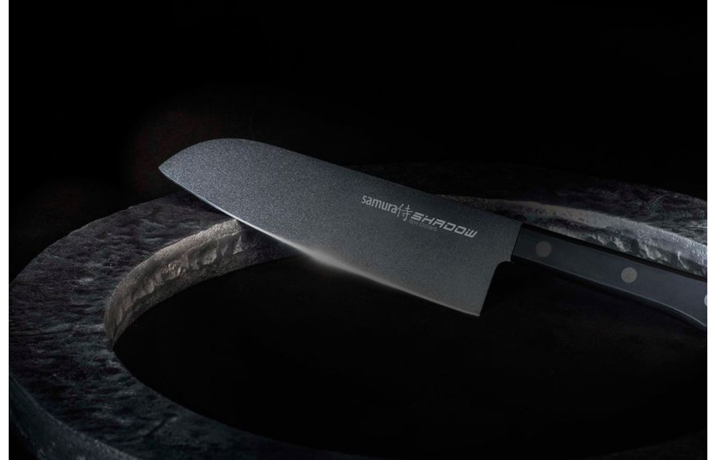 Широкий клинок имеет опущенный вниз кончик. Зазор между доской и лезвием получается минимальным, а при нарезке можно даже не отрывать острие от доски. Широкий обух плавно сужается к режущей кромке, заточенной до бритвенной остроты на водных камнях зернистостью 5000 грит. Лезвие из коррозиестойкой стали AUS-8 закалено до твердости 58 HRC и долгое время не требует заточек, при этом достаточно вязкое и гибкое, хорошо переносит нагрузки и не склонно к появлению ржавчины. Особенность кухонного ножа из серии Samura Shadow — покрытие Black Fuso, благодаря которому ломтики не прилипают к лезвию при шинковке, тем самым облегчая и ускоряя нарезку.