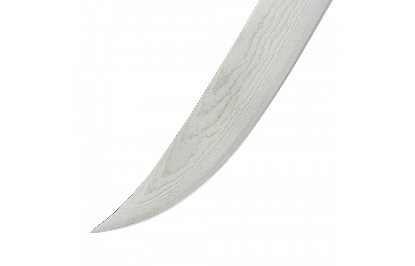 У ножа Samura SULTAN для нарезки, 210 мм – очень удобная и эргономичная рукоять, которая повторяет изгибы ладони. Пальцы обхватывают рукоять Пчака и упираются кончиками в ладонь. Такой кухонный нож весьма удобен при нарезке овощей и мяса - кисть меньше устает, да и сам хват становится крепче. При случайном резком движении, широкая пята в основании клинка, заменяющая упор, не дает соскользнуть пальцам под режущую кромку ножа.