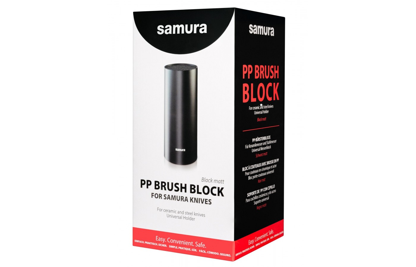 Компактная подставка для керамических и стальных ножей. В зависимости от размера в подставку входит до 7 ножей. В отличие от деревянной подставку Samura легко вымыть, сполоснув щетку-накопитель под краном или в посудомоечной машине. Ножи всегда будут в чистоте и безопастности.