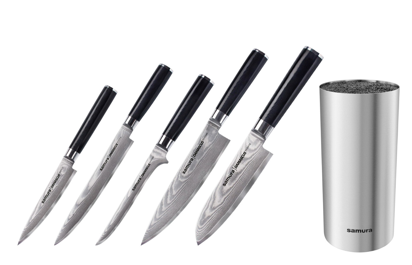 Набор из 5-ти ножей Samura Damascus Универсальный 125 мм, Для Нарезки 230 мм, Нож Samura Damascus Обвалочный 165 мм, Шеф 200 мм, Сантоку 145 мм и подставки – это изделия исключительно высокого качества, и их эксплуатация приносит только лучшие впечатления. Ножи созданы из слоистой дамасской стали, и это делает их надежными и особо острыми, не нуждающимися в частом затачивании. Они легко моются, не переносят запахи, и не имеют прочих недостатков.