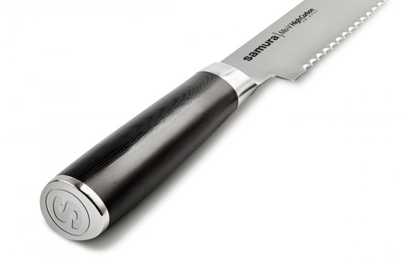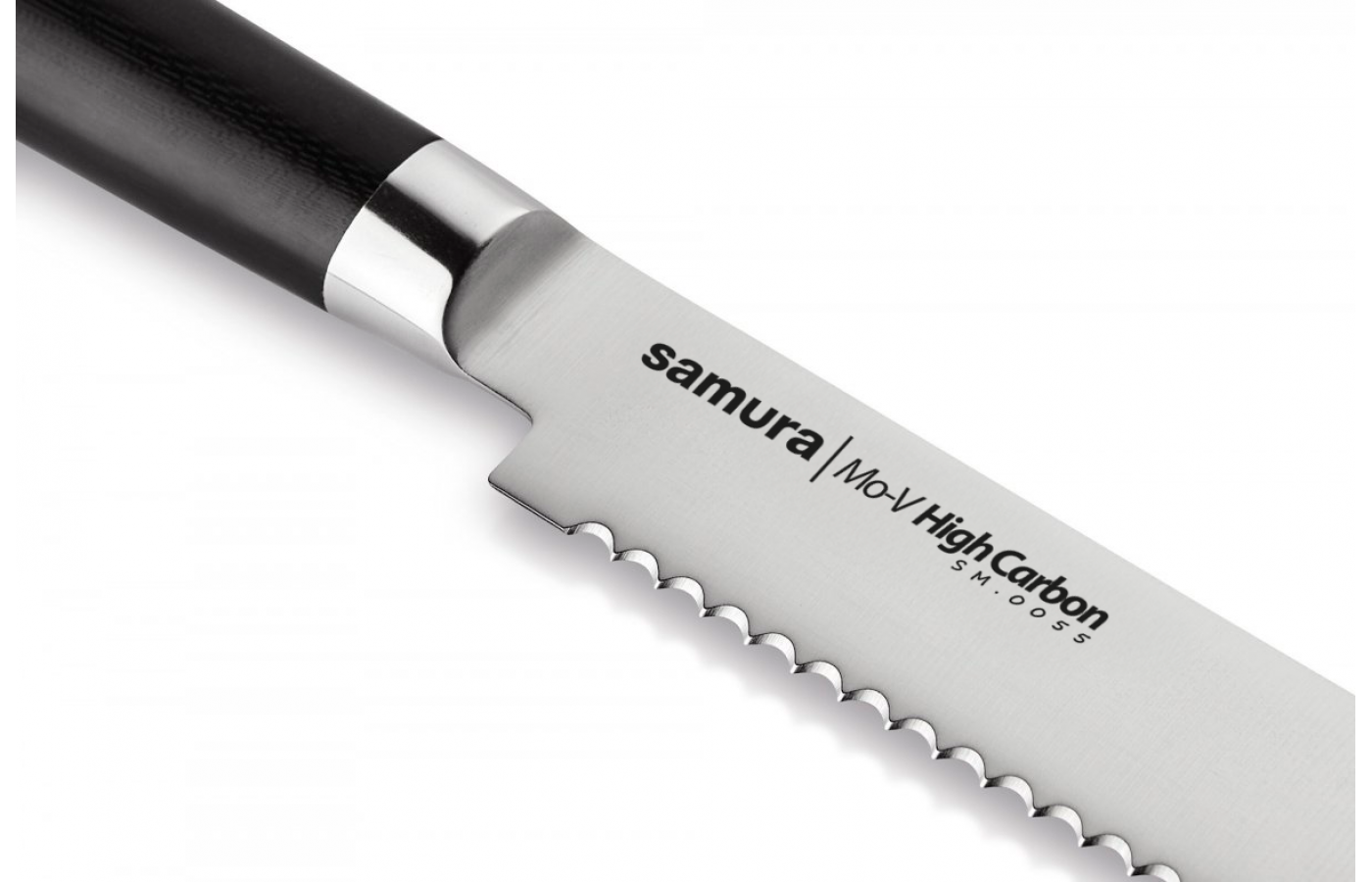 Хлебный нож из популярной у покупателей линейки Samura Mo-V имеет длинное прямое лезвие и подходит для нарезки батонов, краюшек, булочек и других изделий практически любого размера. Также этот клинок уместно использовать для нарезки продуктов со схожей с хлебом текстурой – твердой оболочкой и нежной мякотью (помидоров, ананасов, цитрусовых). А благодаря длинному лезвию подойдет даже для резки плодов бахчевых — арбузов, дынь, тыквы. Кончик клинка заостренный, но опущен на одну линию с режущей кромкой. Такая конструкция вкупе с зубчатой режущей кромкой позволяет инструменту буквально пилить продукт с одного движения.