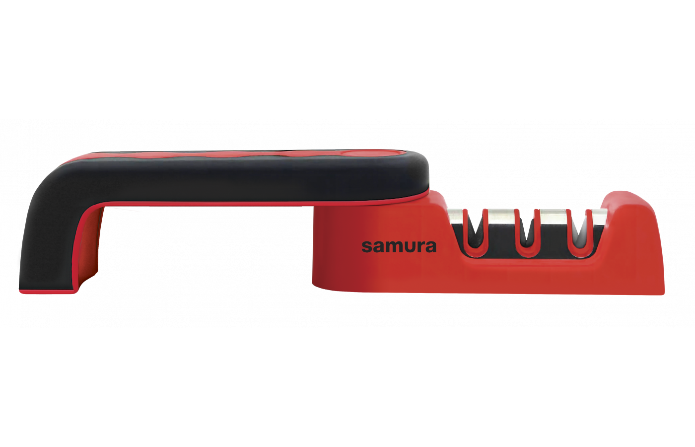 Samura KSS-3200R — ручная трёхфункциональная точилка для кухонных ножей. У неё складной корпус: открывается кнопкой и поворотом рукояти, после работы так же складывается для хранения.