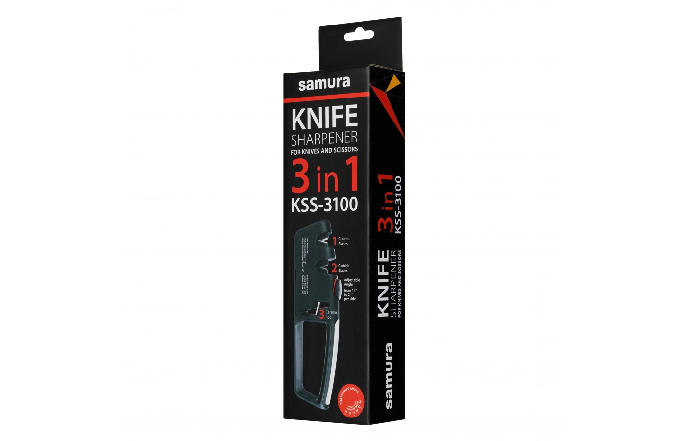Samura KSS‑3100 – трёхфункциональная ручная точилка для кухонных ножей и ножниц. Компактный и лёгкий аксессуар, который за считанные минуты вернёт лезвиям идеальную остроту.