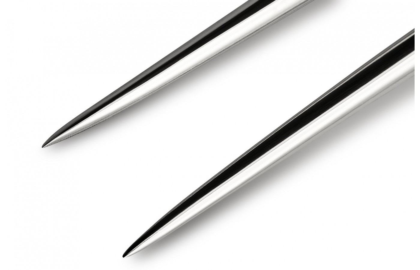 Рукоять вилки выполнена из композитного материала стеклотекстолита G-10, прочного и надежного, устойчивого к воздействию высоких температур и влаги. Внешне имитирует древесный рисунок и имеет красивый универсальный черный цвет. Ручка приятная на ощупь, имеет классическую цилиндрическою форму, обеспечивает комфортный и надежный хват, устойчива к нагрузкам.
