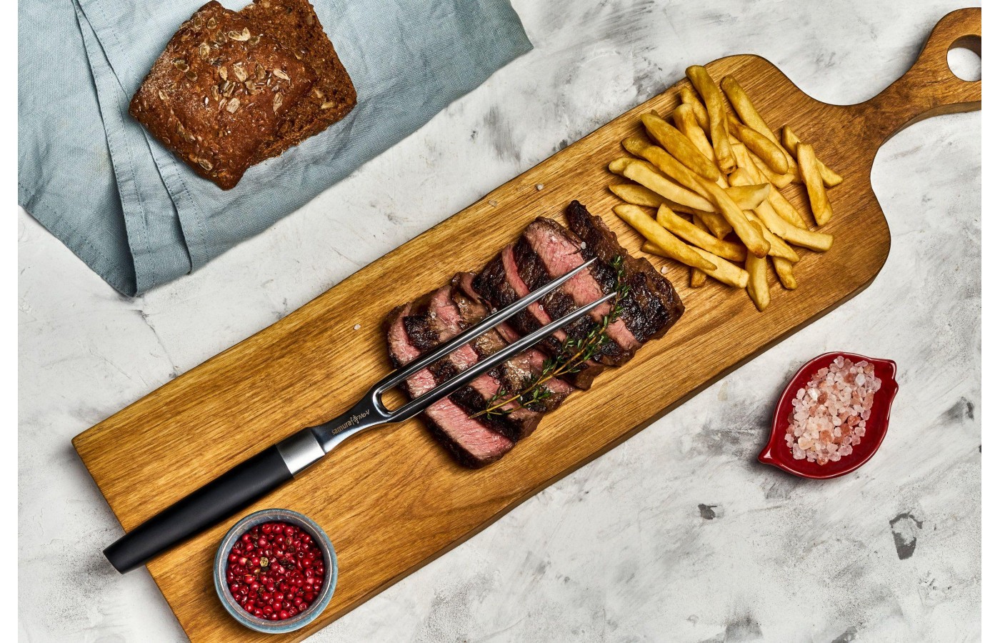 Крупная вилка для мяса с двумя крепкими заостренными зубцами и удлинённой ручкой отличается от сервировочной вилки не только внешне, но и по назначению. Этот инструмент предназначен для придерживания крупного куска мяса во время или после приготовления, при раздаче блюда. Специалисты называют эту вилку транжирной. С ее помощью удобно достать горячий кусок мяса из бульона, проверить готовность в жаровне, снять шашлык с шампуров, нарезать ростбиф на порционный кусочки, переложить замаринованную птицу из контейнера на противень и совершать другие подобные манипуляции, не опасаясь обжечь или испачкать руки.